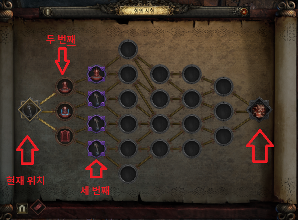 자신이 원하는 시련과 다음 맵으로 이동하는 경로등을 생각하여 시련을 선택해야 한다